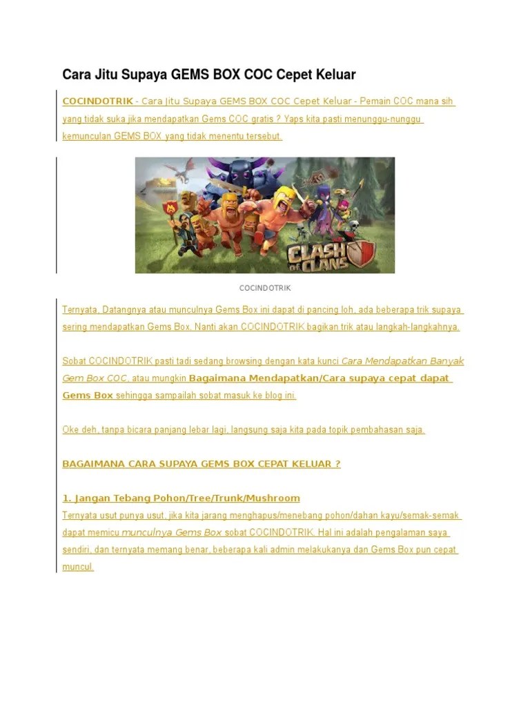 Trik coc cara mempercepat kemunculan gems box cepat keluar clash of clans untuk mendapatkan gems gratis coc. Cara yang ada diatas bisa dengan cepat mendapatkan gem box nantinya. Karena gems box ini special. Kalian pasti lagi cari cara dapat gems dengan cepat kan ? Namun juga ada cara cepatnya yakni dengan membeli gem dalam jumlah. Yang menjadi perhatian lebih dari obstacle adalah gems box. Untuk itu, jangan tinggalkan base coc lebih dari satu minggu. Jarang muncul dibandingkan yang lain. Adapun 20 gems hanya tersedia pada kotak gem box yang akan muncul di village. Jangan menebang tree · 2. Lakukan donasi lebih sering di dalam clan yang anda ikuti. Selain bikin kotor, untuk membersihkannya juga butuh resources. Awal permainan, saya merasa malas dengan si obstacles ini.